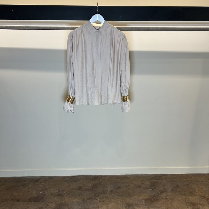 Camicia beige realizzata in tessuto molto leggero e fresco abbottonatura frontale a scomparsa colletto classico piccole arricciature sulla spalla polsino rinforzato con doppia rouches fit oversize vestibilità ampia veste fino ad una M è possibile abbinarla ai pantaloni con tasche beige