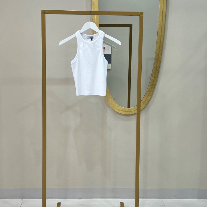 Tio Crop colore bianco senza maniche realizzato in un cotone elasticizzato a costine collo rotondo vestibilità fino alla L da considerare che potrebbe accorciarsi rispetto ad una figura di tg S lunghezza alla vita su di un peso di 55kg
