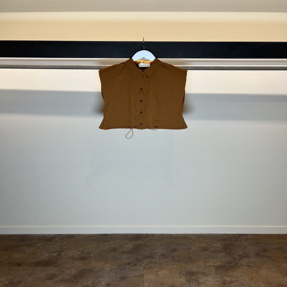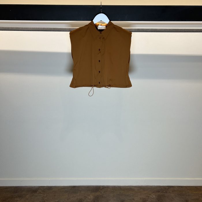 Camicia in nylon senza maniche realizzata in un tessuto tipo “paracadute” colletto camicia classico coulisse in vita fit dritto spalline imbottite abbottonata frontale vestibilità dritta al corpo corta in vita