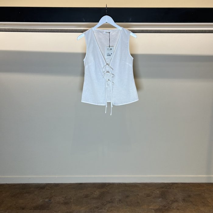 Gilet bianco abbottonatura frontale tramite lacci senza maniche realizzato in un tessuto molto leggero e fresco