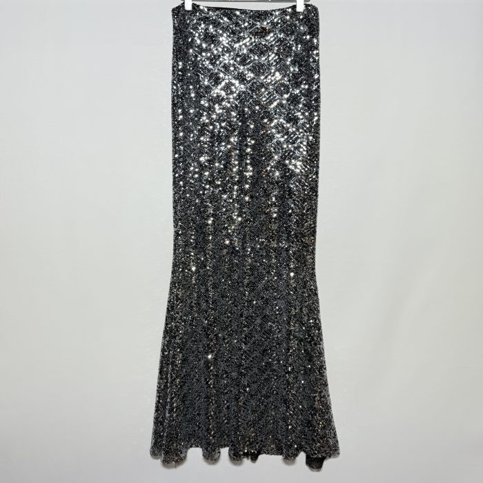 Gonna in pailettes argento modello a sirena , lunghezza alla caviglia, completamente foderata, fit aderente al corpo nei fianchi e in gamba fino ad arrivare all’orlo che crea effetto svasato, vestibilità fedele alla taglia del prodotto