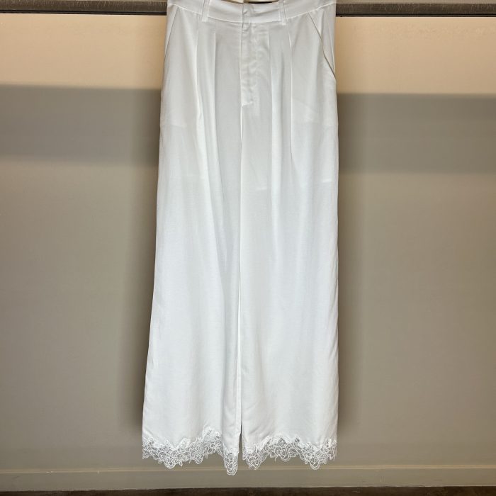 Pantaloni bianchi a palazzo con chiusura sulla parte frontale tramite zip e bottone tasche a uomo passanti in vita fit largo e vestibilità regolare presentano sulla parte finale un dettaglio di pizzo e micro glitter