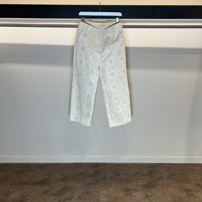 Pantaloni in pizzo sangallo realizzati in cotone tipo jeans color burro abbottonatura frontale con zip e gancetto invisibile fit a sigaretta vita bassa vestibilità regolare è possibile abbinarlo al suo gilet