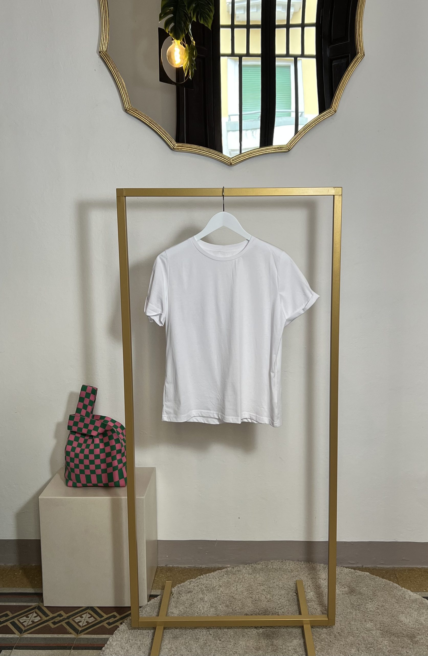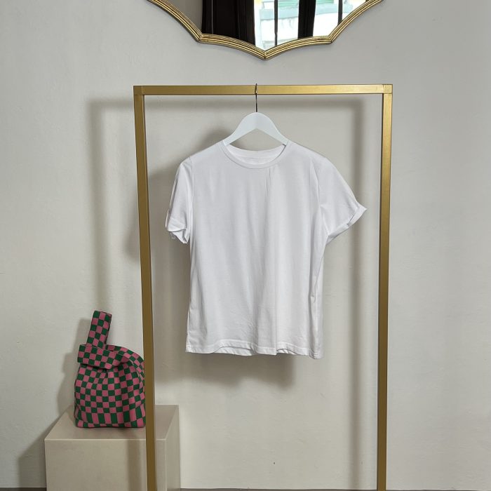 T-shirt classica bianca girocollo mezza manica con risvolto fit regolare lunghezza sotto la vita tessuto molto fresco e liscio non classico cotone