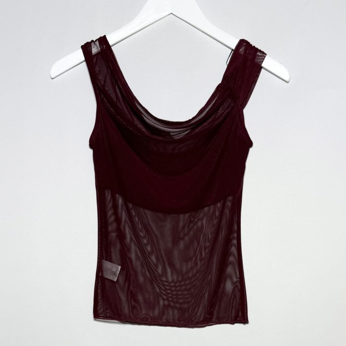 Top in organza bordeaux, spalline larghe asimmetriche, effetto trasparente con fascia coprente a fodera nel seno, fit corto e aderente, vestibilità dalla taglia XS alla M