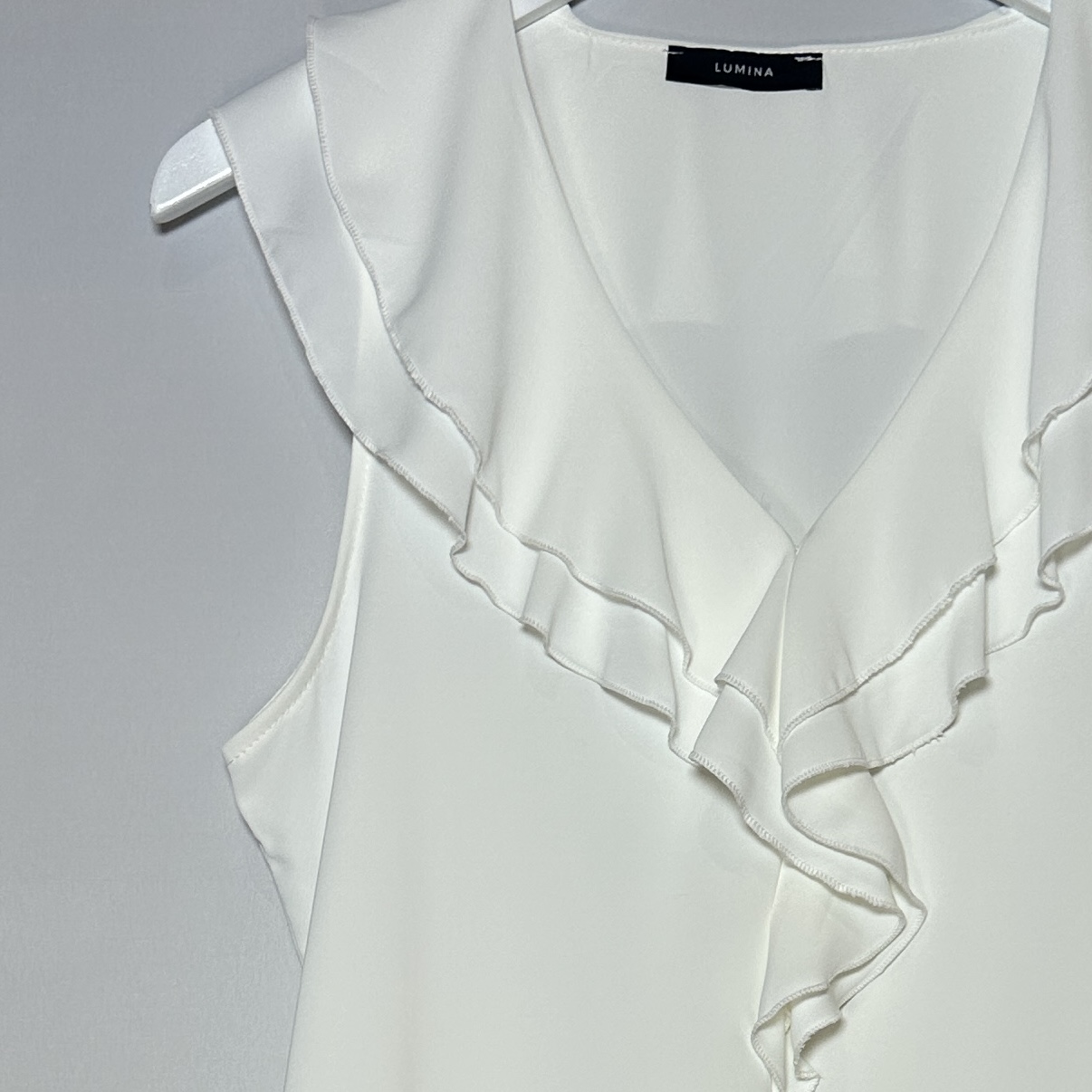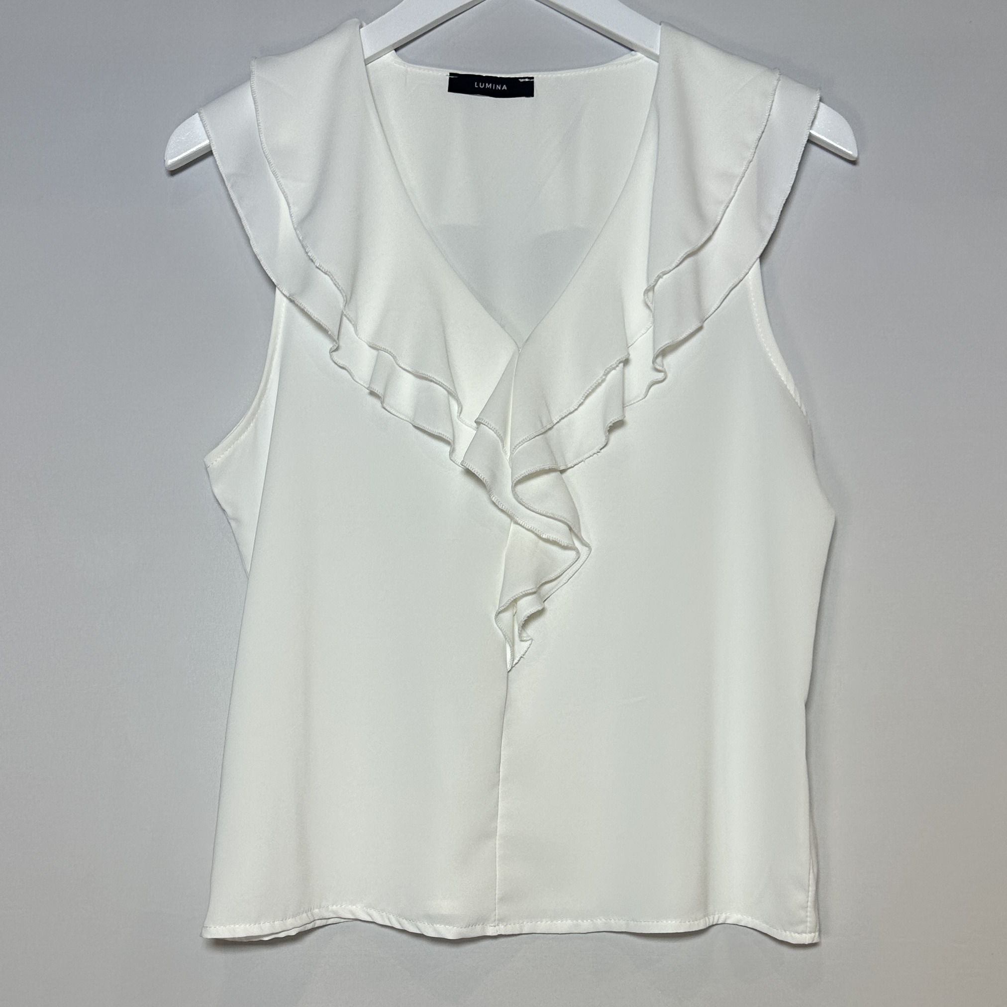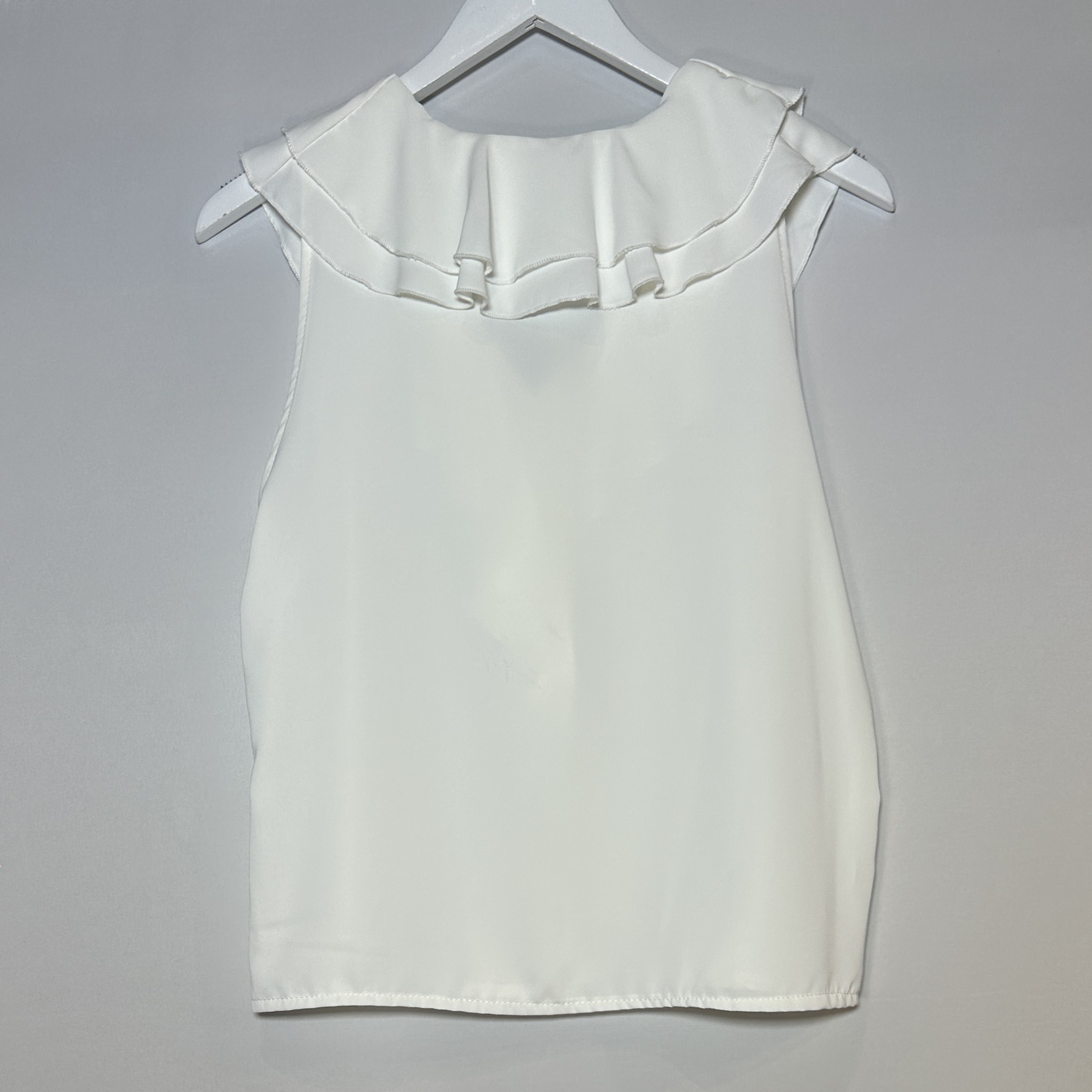 Top camicia bianco con dettaglio volant sia nel davanti che nel retro girocollo, scollo a V,  giromanica, lunghezza alla vita, tessuto morbido