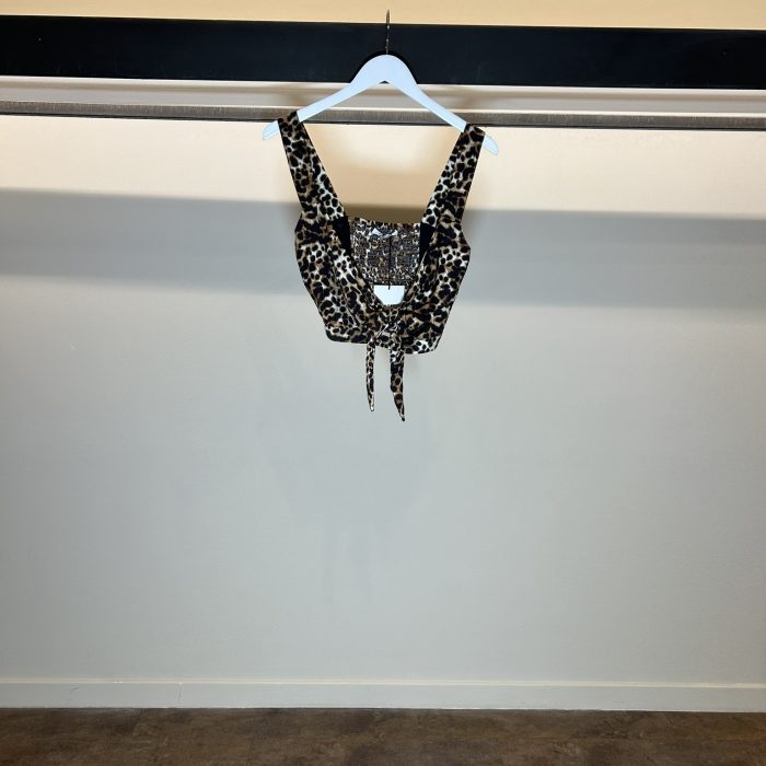 Top leopardato con chiusura fiocco sul davanti senza maniche spalla larga lunghezza appena sopra la vita scollo a cuore vestibilità stretta al corpo