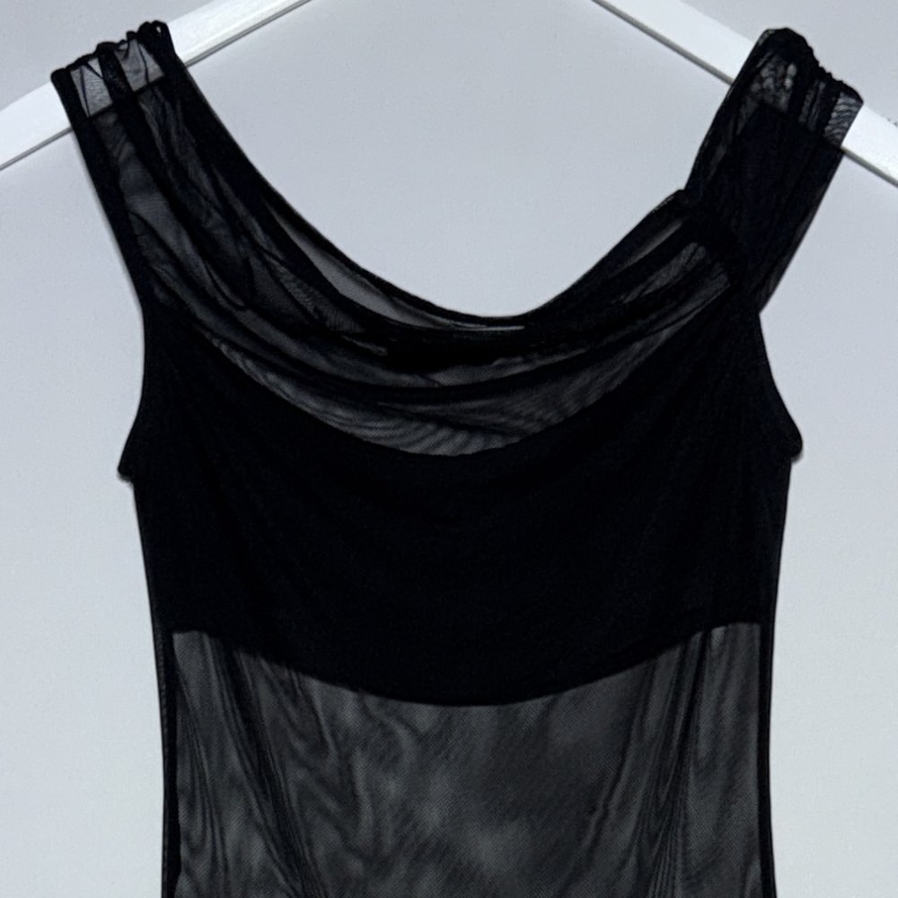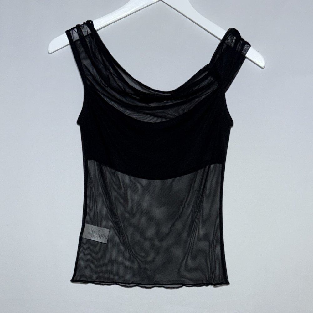 Top in organza nero, spalline larghe asimmetriche, effetto trasparente con fascia coprente a fodera nel seno, fit corto e aderente, vestibilità dalla taglia XS alla M
