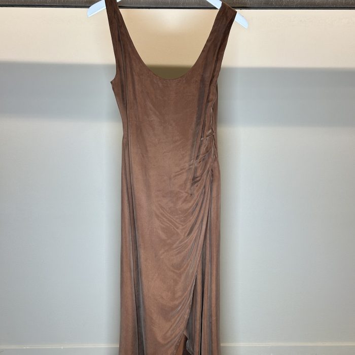 Abito lungo smanicato con spalle arrotolate presenta delle arricciature sulla parte laterale vestibilità regolare